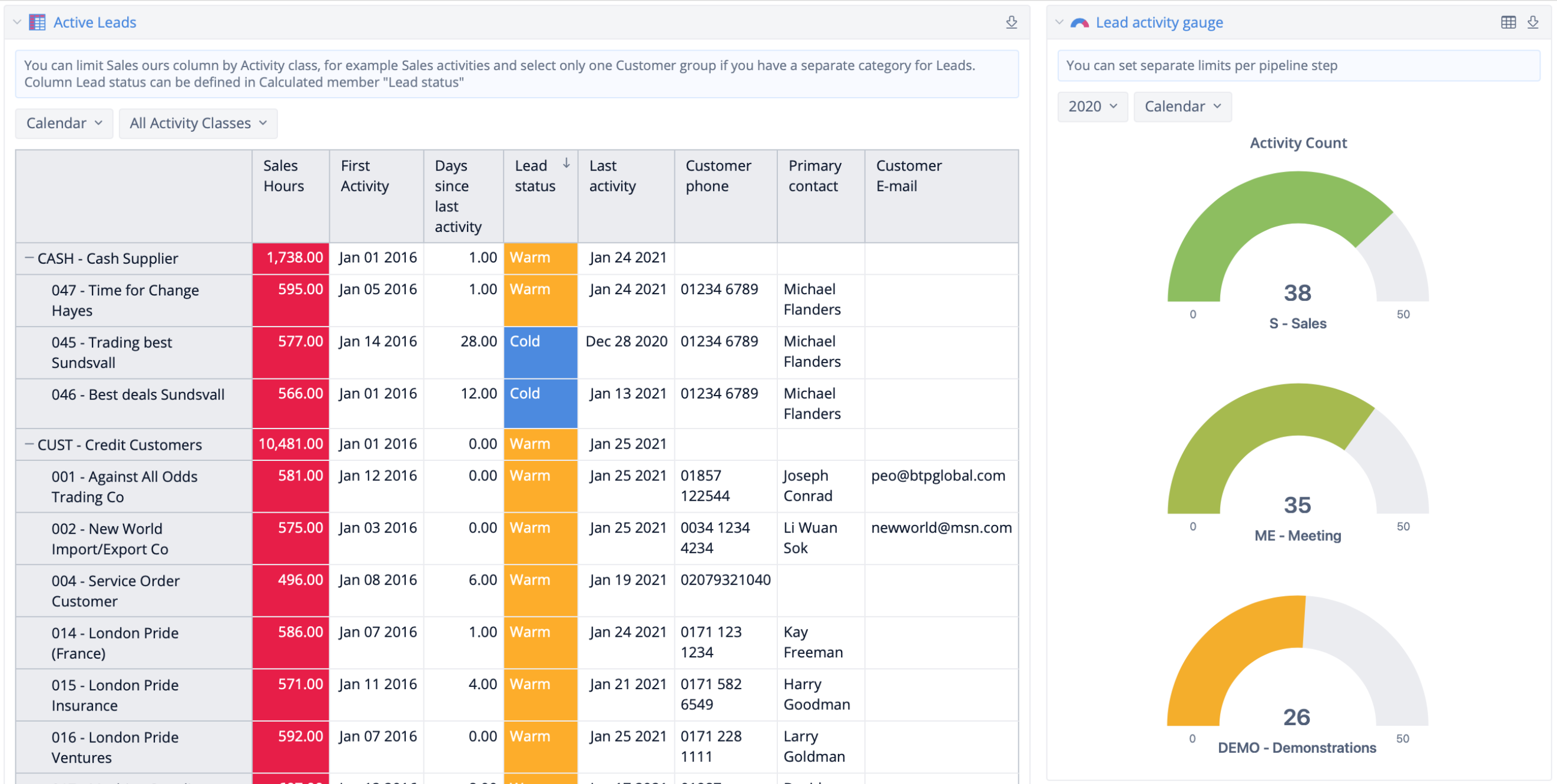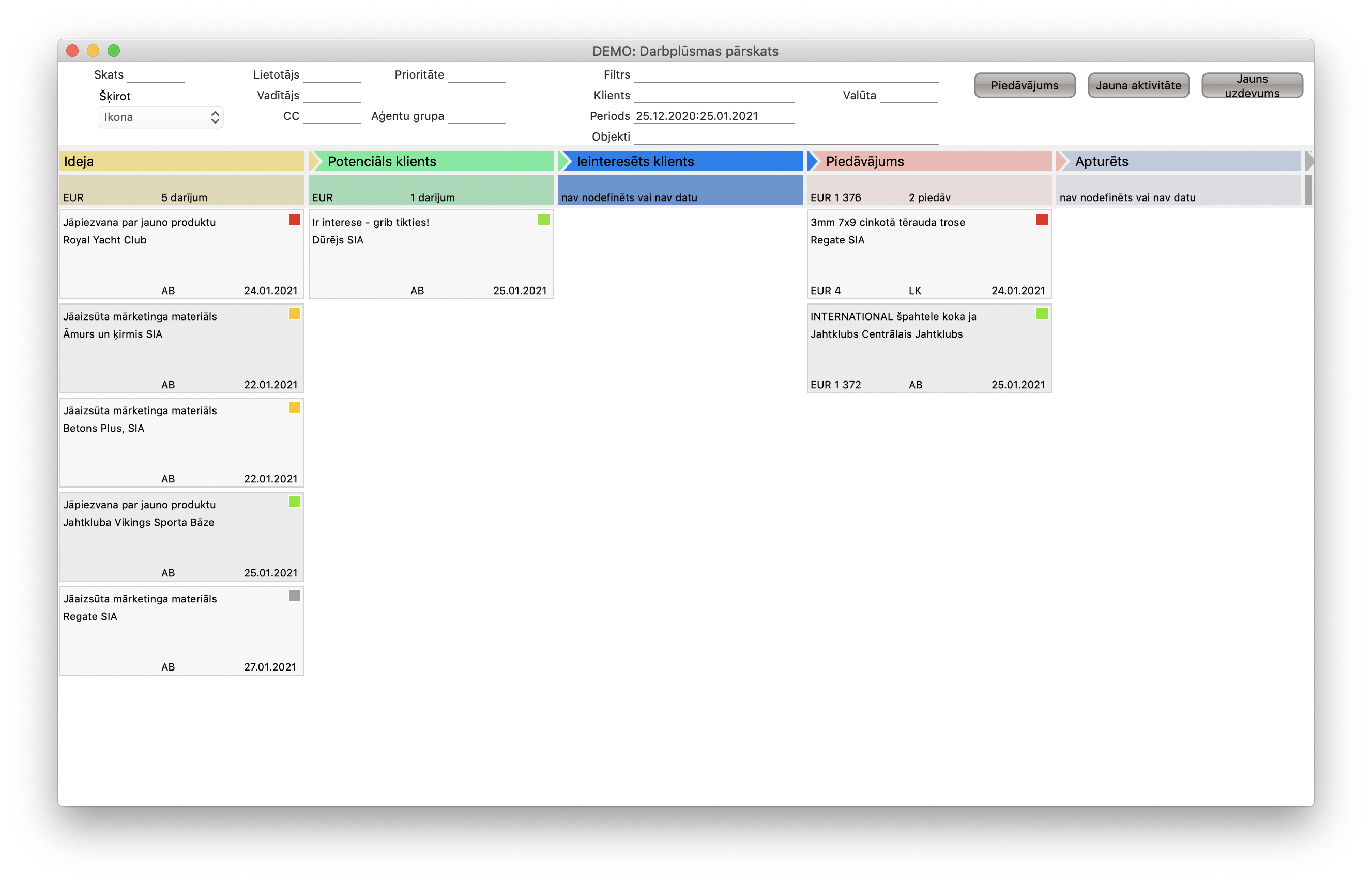 Klientu attiecību vadības jeb CRM sistēmā ir iespējams norādīt visus darba uzdevumus, notikumus un tikšanās ar klientiem, kā arī pārdošanas kontaktus un dažādas vienošanās. Šīs darbības un notikumi ir redzami uzņēmuma darbiniekiem. Nepieciešamības gadījumā tos var arī mainīt un papildināt.