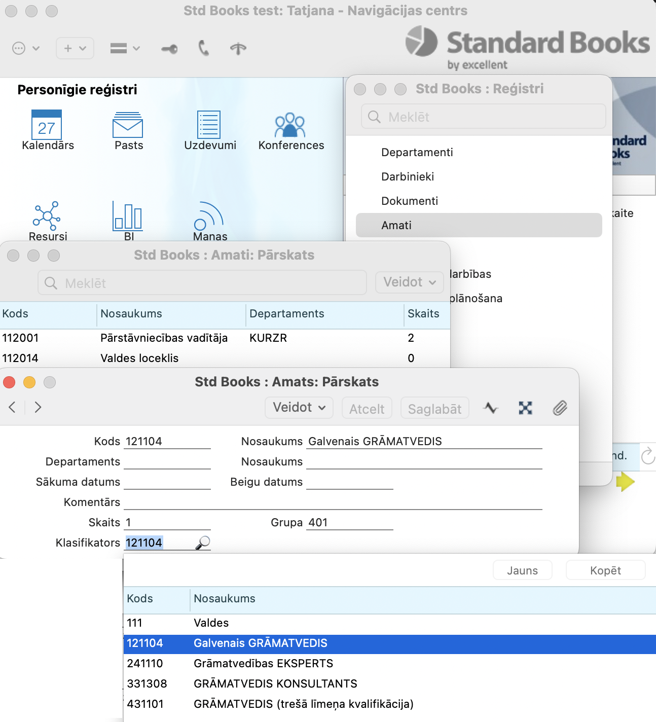 – Personāls > Reģistri > Amati – ierakstā arī jānorāda: