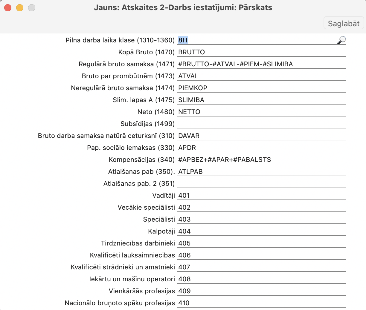 NB! Programma atbalsta Operāciju tipu ievietošanu iestatījuma laukos bez # zīmes, piemēram, BRUTTO (kā ir redzams paraugā augšā, 1470.rindā) un atbalsta formulu veidu ievadi, bet tad ir jābūt # pie katra Operācija tipa, piemēram #BRUTTO-#ATV