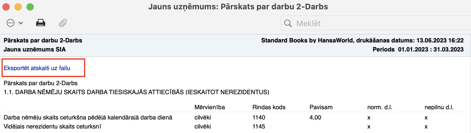 1. Personāls > Atskaites > 2-Darbs > palaist atskaiti par konkrēto periodu > nospiest pogu Eksportēt atskaiti uz failu. Uzspiežot pogu, programma ļaus saglabāt XML failu jūsu datorā.
