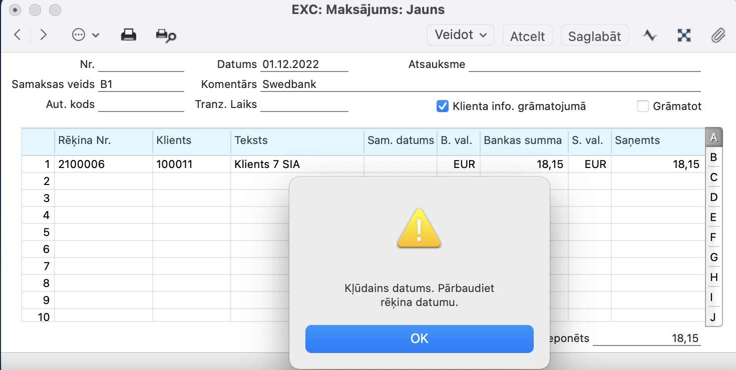Apstiprinot Maksājuma ierakstu, parādās paziņojums “Kļūdains datums”.