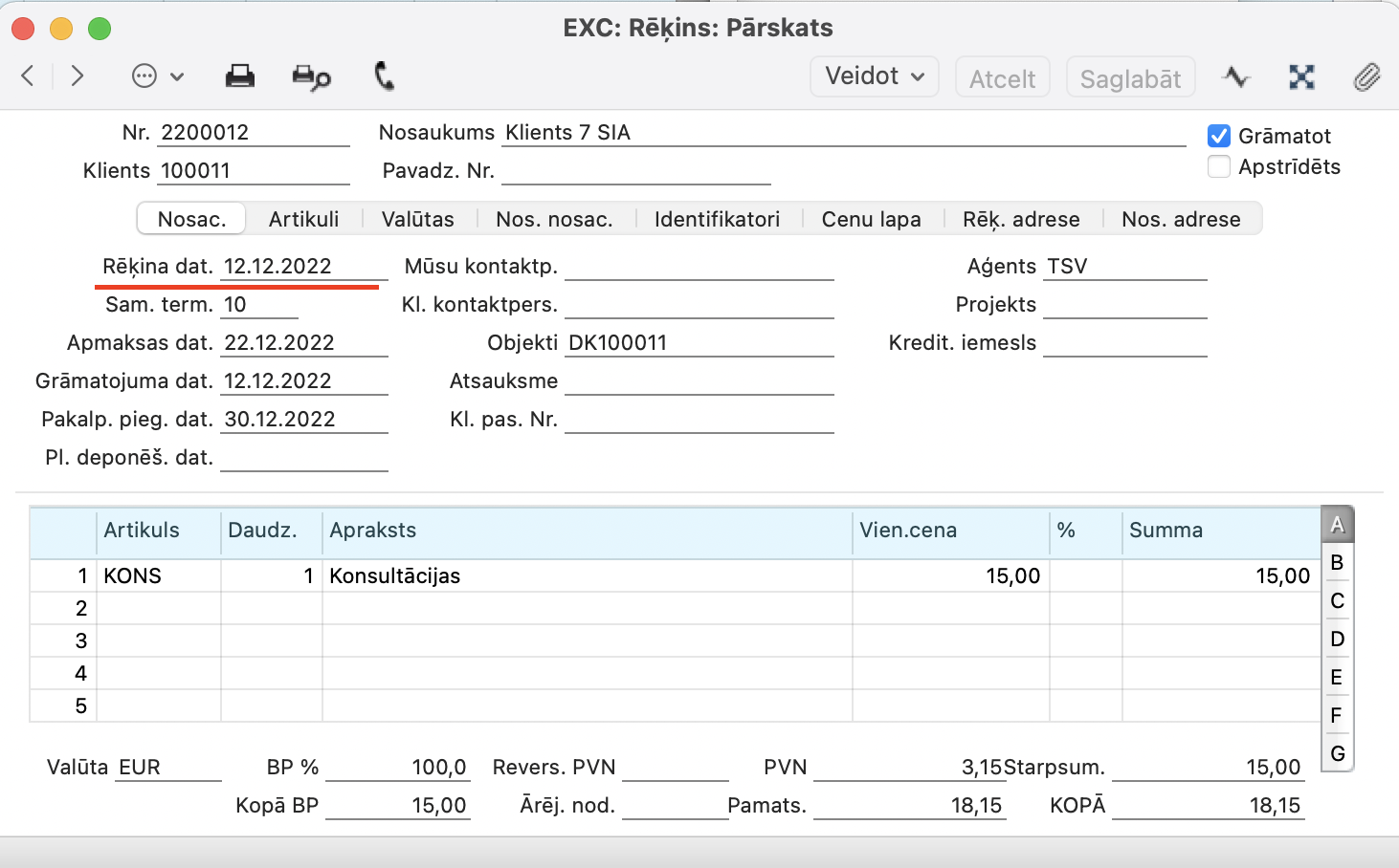 Modulī Realizācija > Reģistri > Maksājumi ieraksta datums nedrīkst būt agrāks par Rēķina ieraksta datumu (sistēma neļaus izvēlēties šādus rēķinus).