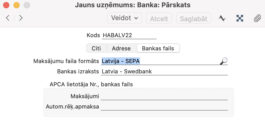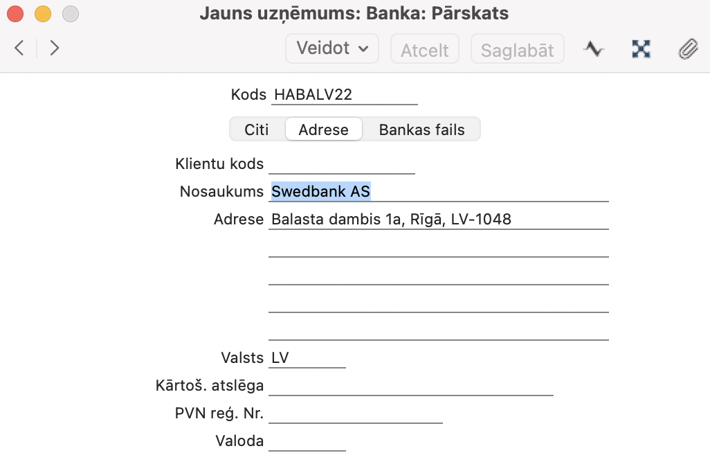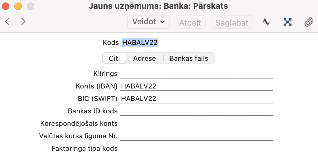 Atverot iestatījumu, tiek atvērts logs “Bankas: pārskats”. Lai izveidotu jaunu banku, izvēlnē “Veidot” izvēlieties “Jaunu ierakstu – Bankas”. Ievadiet bankas kodu un nosaukumu, BIC / SWIFT kodu un citu svarīgu informāciju.