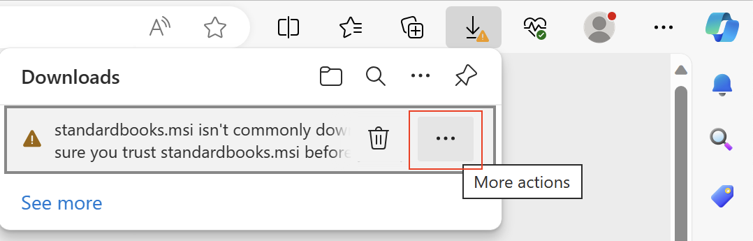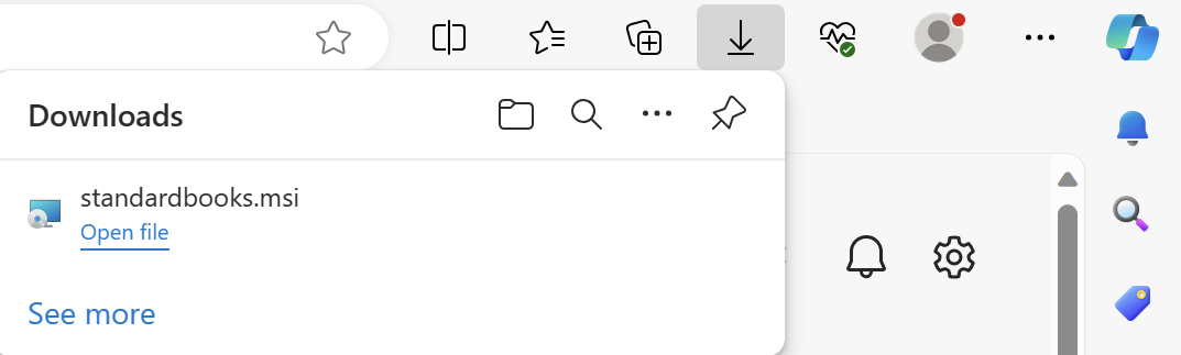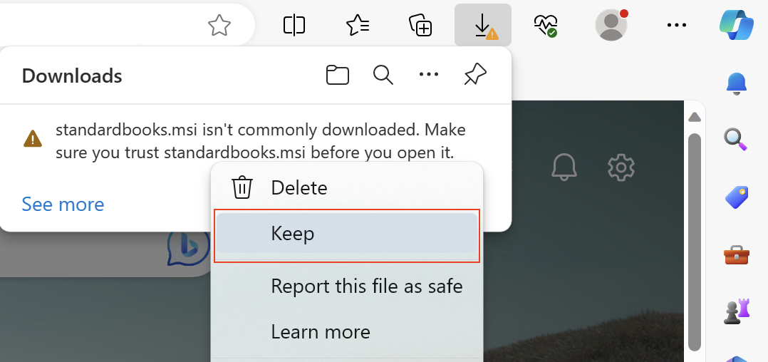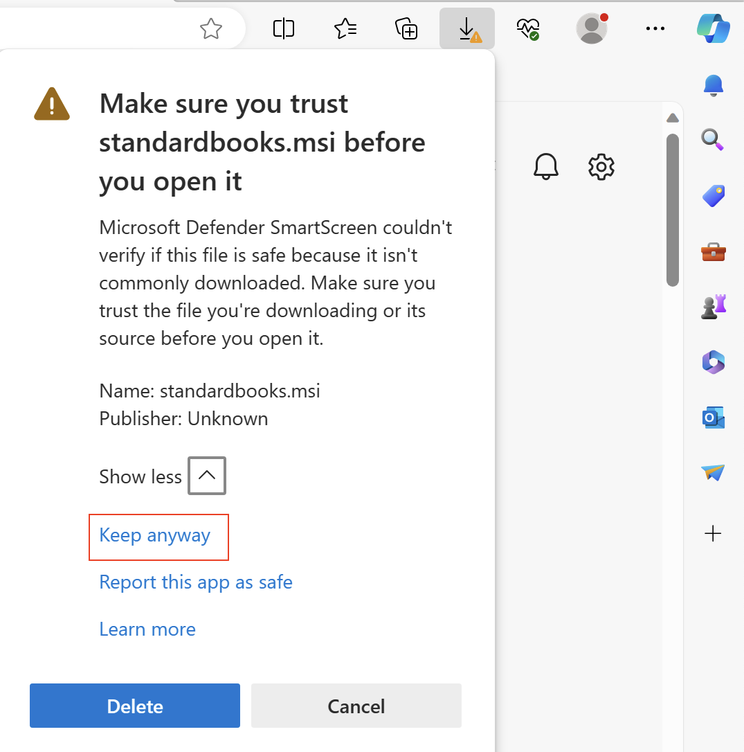 Ja pēc programmas lejuplādēšanas (jūsu Interneta pārlūkā zem lejuplādēšanas ikonas) parādās uzraksts Standardbooks.msi isn’t commonly downloaded. Make sure you trust standardbooks.msi before you open it, jārīkojas šādi: