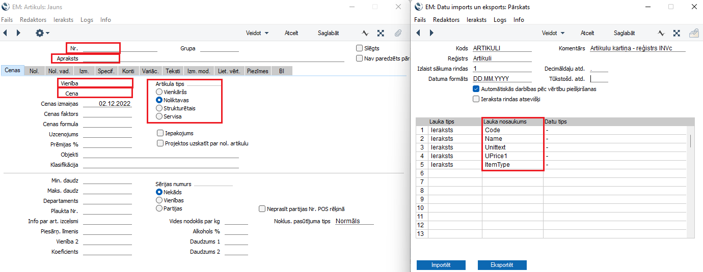 Lauku nosaukumi datu importa logā (bildē pa labi) redzamajā tabulā atbilst šādiem laukiem artikula kartītē (bildē pa kreisi):