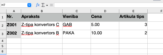 3. Pārliecinieties, ka summas decimāldaļu atdalītājs dokumentā sakrīt ar norādīto datu importa logā. Kā arī sākuma horizontālo rindu skaits jūsu tabulā sakrīt ar norādīto (skat. Artikula kartītes importa 3.punktu).