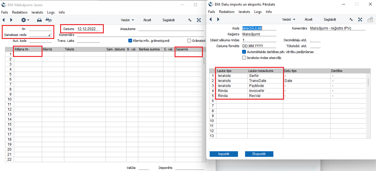 Lauku nosaukumi datu importa logā (bildē pa labi) redzamajā tabulā atbilst šādiem laukiem izejošā rēķina kartītē (bildē pa kreisi):