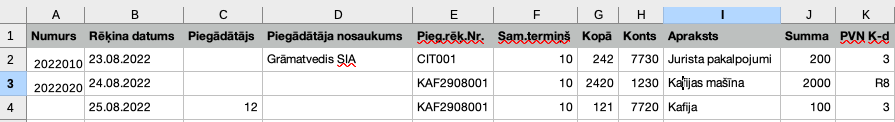 Datums – grāmatojuma datumam jābūt formātā, kāds norādīts datu importa logā (pēc noklusējuma – DD.MM.YYYY).