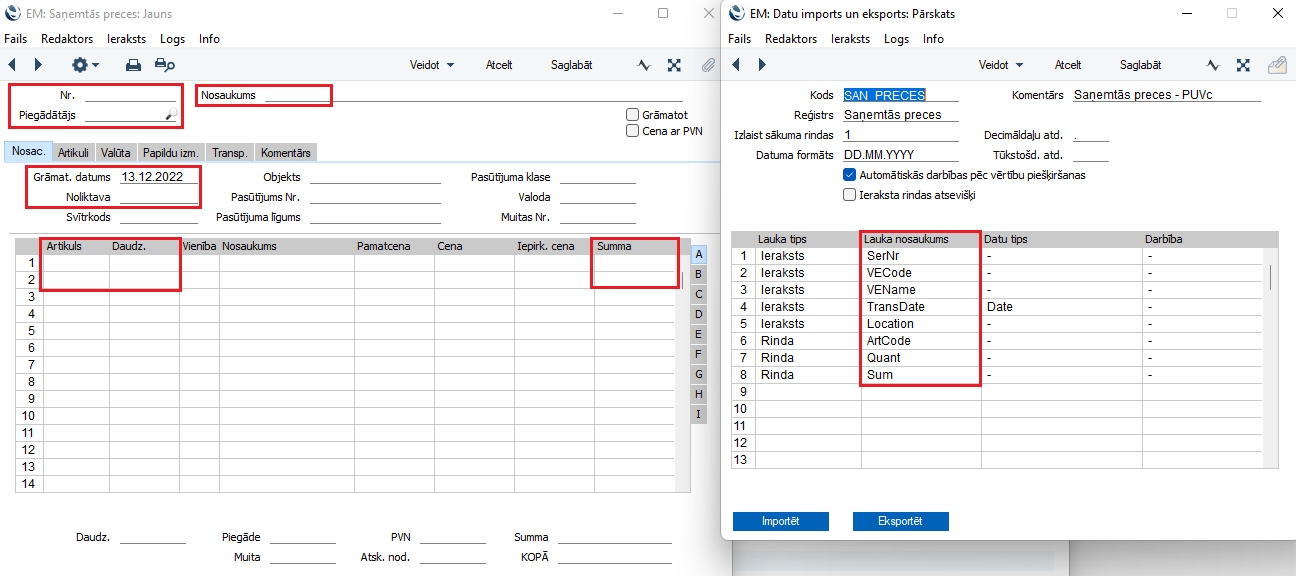Lauku nosaukumi datu importa logā (bildē pa labi) redzamajā tabulā atbilst šādiem laukiem saņemtās preces kartītē (bildē pa kreisi):
