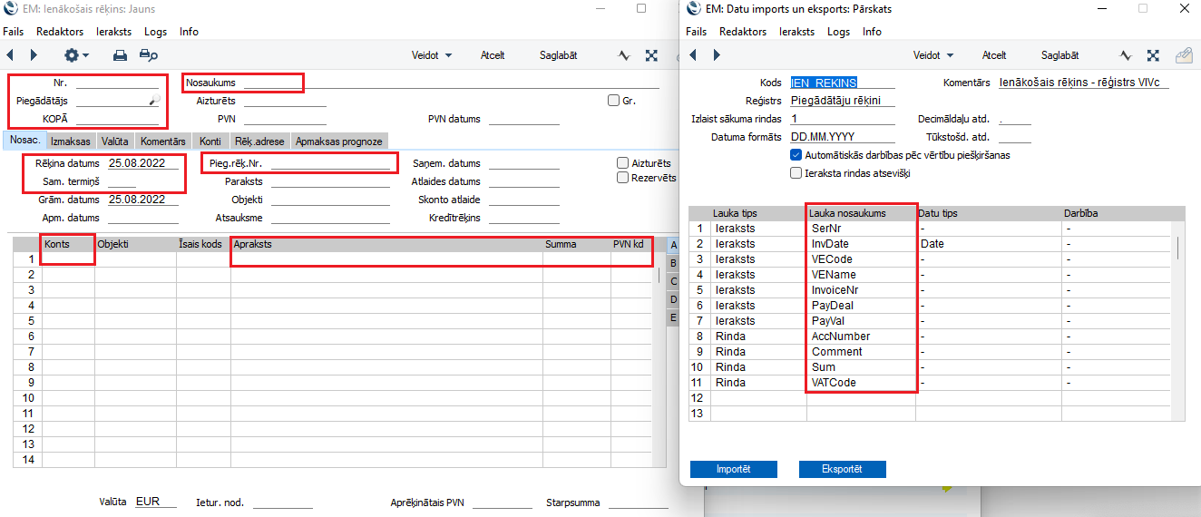 Lauku nosaukumi datu importa logā (bildē pa labi) redzamajā tabulā atbilst šādiem laukiem izejošā rēķina kartītē (bildē pa kreisi):