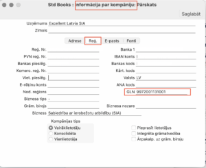 - Pasūtītājam (tā būs jūsu kompānija) tas būtu jānorāda modulī Sistēma > Iestatījumi > Informācija par kompāniju > sadaļa “Reģ.” > laukS “GLN”