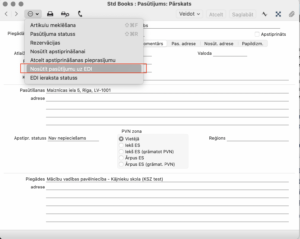 4. Kad Artikuli un Piegādātājs ir ievadīti, ir nepieciešams izveidot pasūtījumu. Dodieties uz moduli Loģistika > Reģistri > Pasūtījumi pārskata logā > Veidot – Jauns pasūtījums. Kad pasūtījums ir gatavs, tad izvēloties “Nosūtīt pasūtījumu uz EDI”, tas izveidos eksporta failu uz servera, kurš periodiski (reizi stundā) tiks sūtīts uz Edisofta serveri caur SFTP (drošu failu apmaiņu).