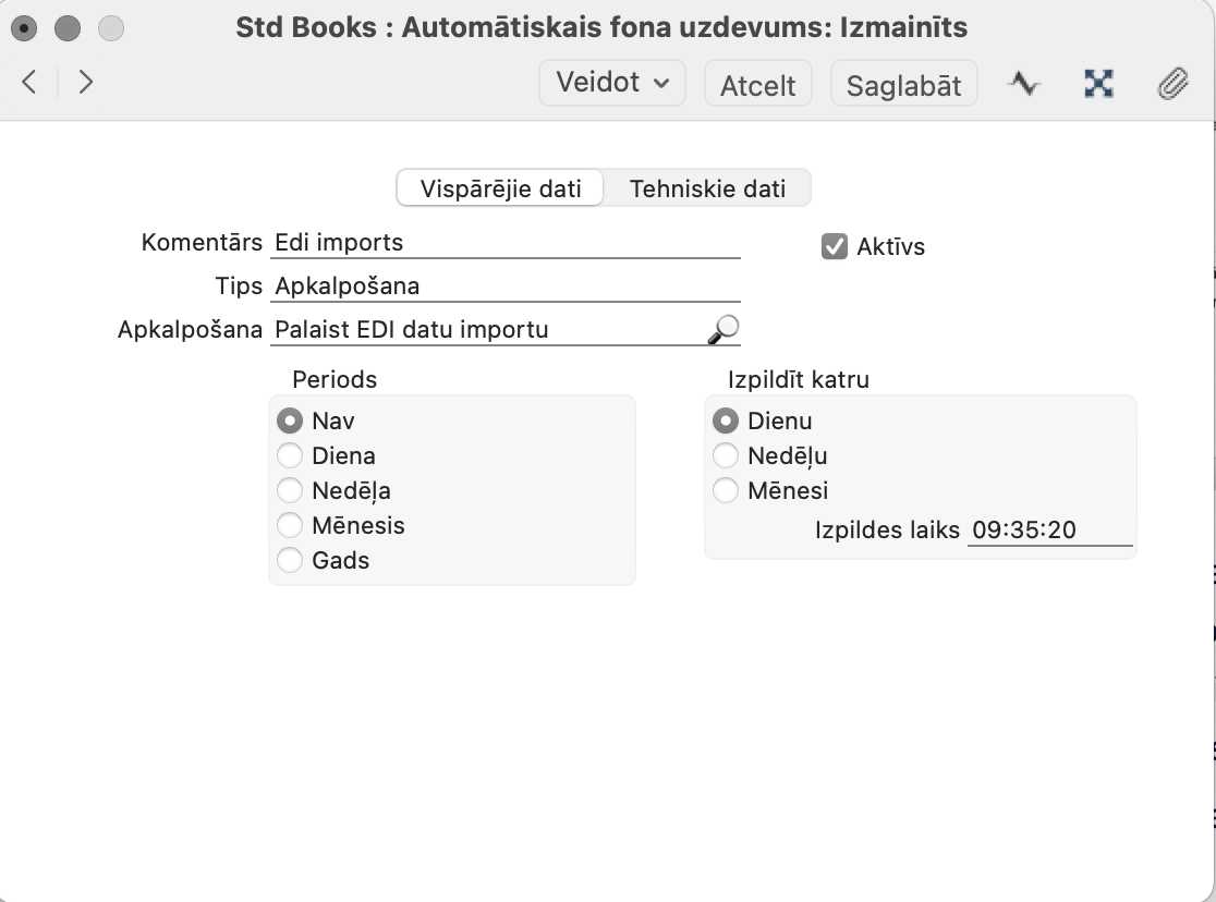 Lai saņemtu importa failus (piegādātāju rēķinus), vajadzīgs modulī Sistēma > Iestatījumi > Automātiskie fona uzdevumi > sadaļā Vispārējie dati > norādīt komentāru, tipu (Apkalpošana), apkalpošanu (Palaist EDI datu importu) un norādīt cikos izpildīt šo apkalpošanu. Jāatzīmē arī ieraksts kā aktīvs.