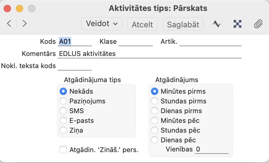 Moduļa CRM > Iestatījumi > Aktivitāšu tipi: Jābūt uztaisītam aktivitāšu tipam: