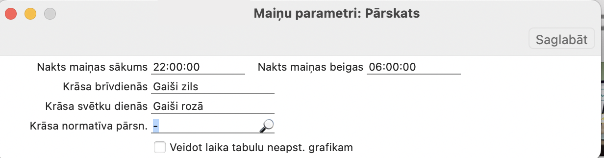 4. Modulī Algas > Iestatījumi > Maiņu parametri ir jābūt noteiktam laikam no:līdz cikiem skaitās nakts maiņas: