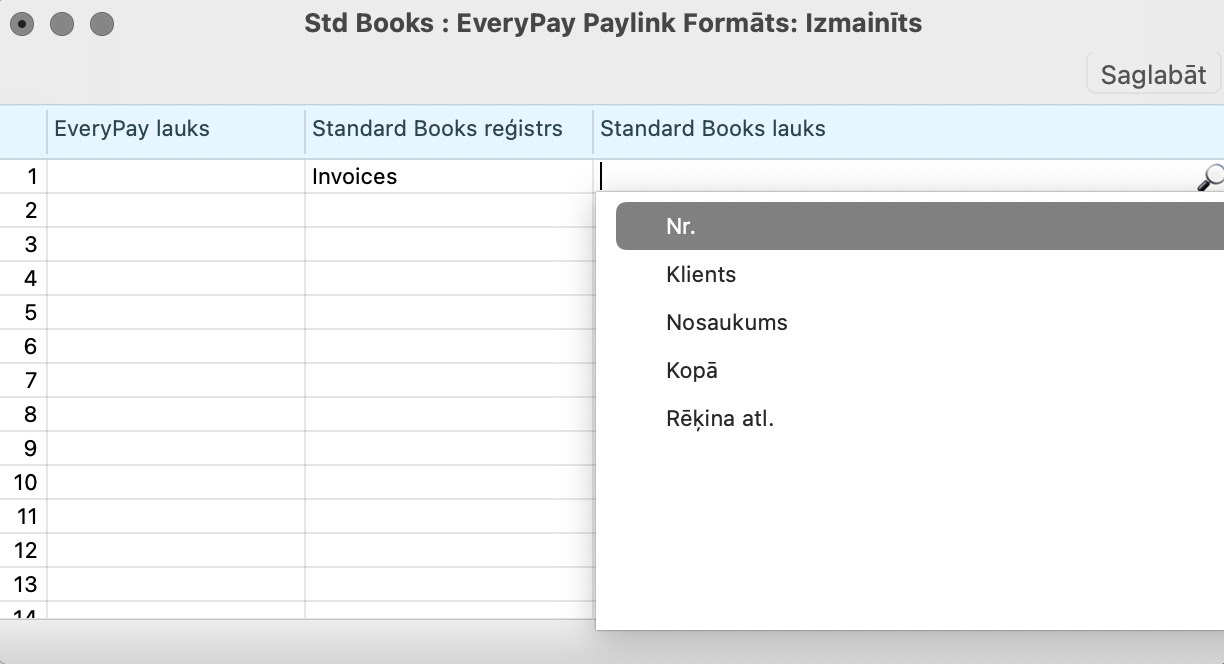Standard Books lauks – šajā slejā atlasiet lauku Standard Books, kuram atbilst Linkpay saites lauks. (NB! Pašlaik tiek atbalstīti tikai rēķina Nr. (nosaukums Nr.), Klienta kods (nosaukums Klients), Klienta nosaukums, Kopā, Rēķina atlikums.