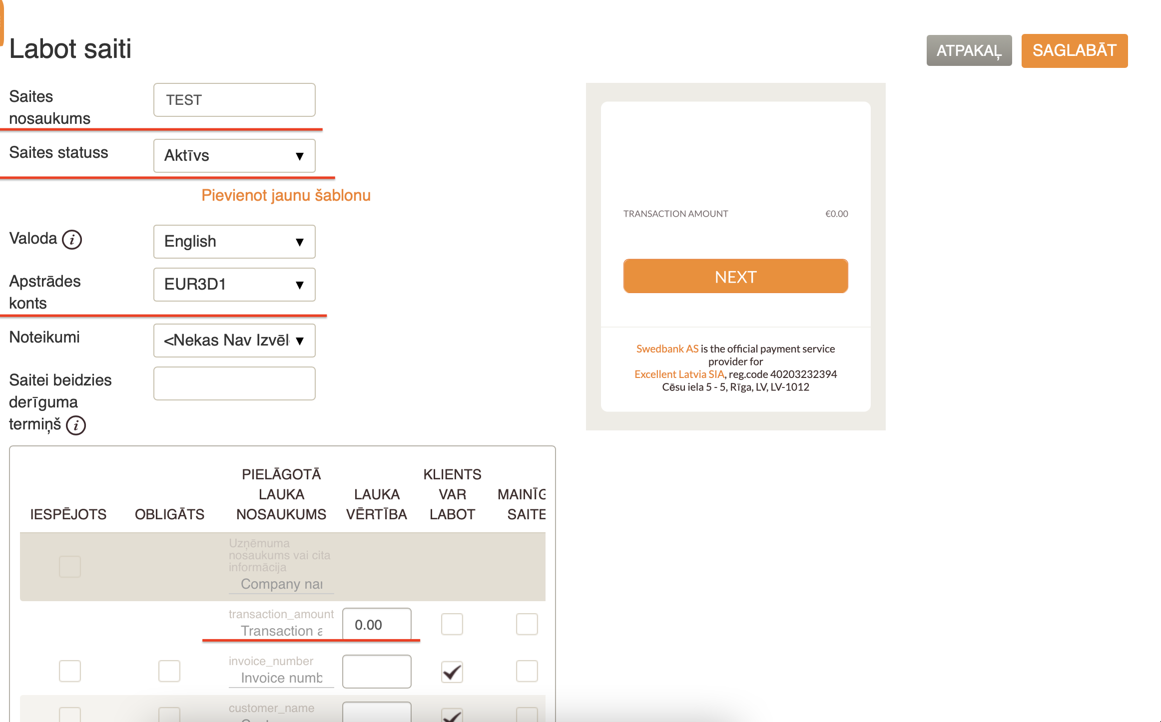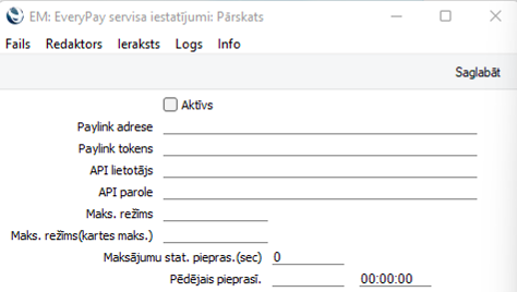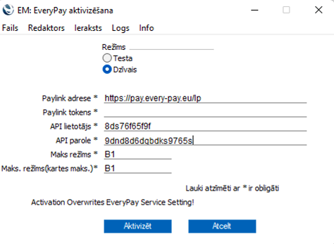 Atveras logs, kur jāaizpilda ar EveryPay saistītos laukus: