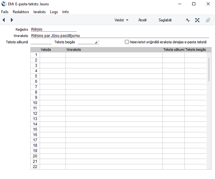 Atzīmējiet “Neievietot oriģinālā ieraksta detaļas e-pasta tekstā”, ja nevēlaties, lai e -pasta pamattekstā tiktu iekļautas dokumentu rindas (pielikuma informācija).
