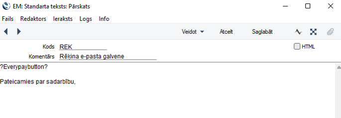 Lai maksājuma saite tiktu automātiski pievienota e-pastam, kas izveidots no rēķiniem, ir jāiestata arī e-pasta teksti.