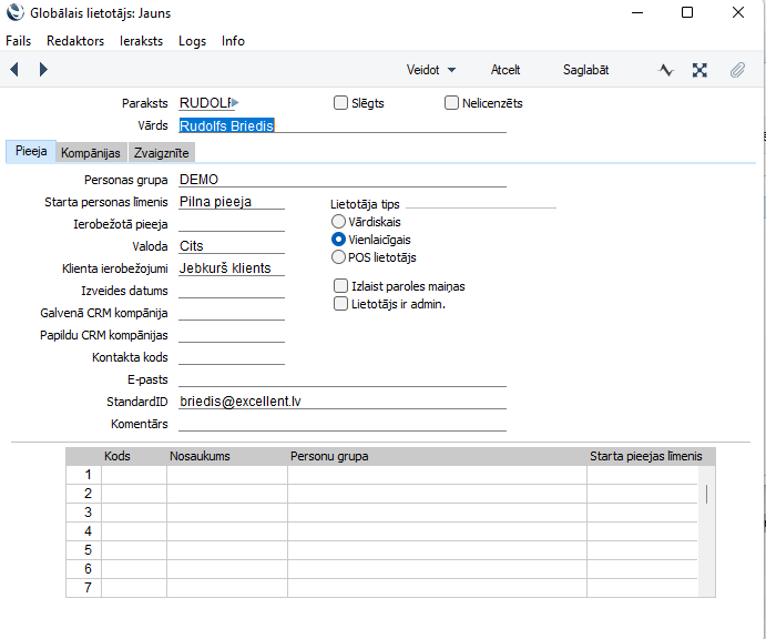 NB! Ja ir vajadzīga pieeja visām kompānijām ar vienādām pieejas tiesībām (norādīts Personu grupas laukā), tad sadaļu “Kompānijas” var atstāt tukšu. Pēc noklusējuma jaunizvaidotajam Globālajam lietotājam būs pieeja visām sistēmā esošajām kompānijām, kas atrodas uz jūsu servera.