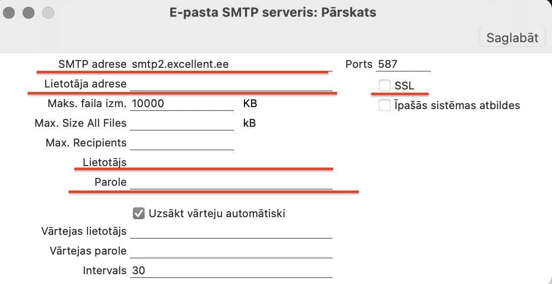 Šajā iestatījumā nepieciešams aizpildīt laukus: SMTP adrese, lietotāja adrese, lietotājs un parole, nepieciešams atķeksēt SSL lauku un intervāla sekundes nomainīt uz Jums vēlamajām.