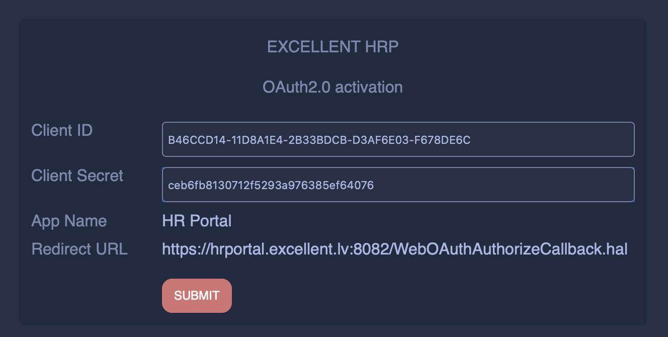 3.3. Formā ievietojiet tikko izveidoto pieeju laukus “Client ID” un “Client Secret” un nospiediet pogu “Submit”