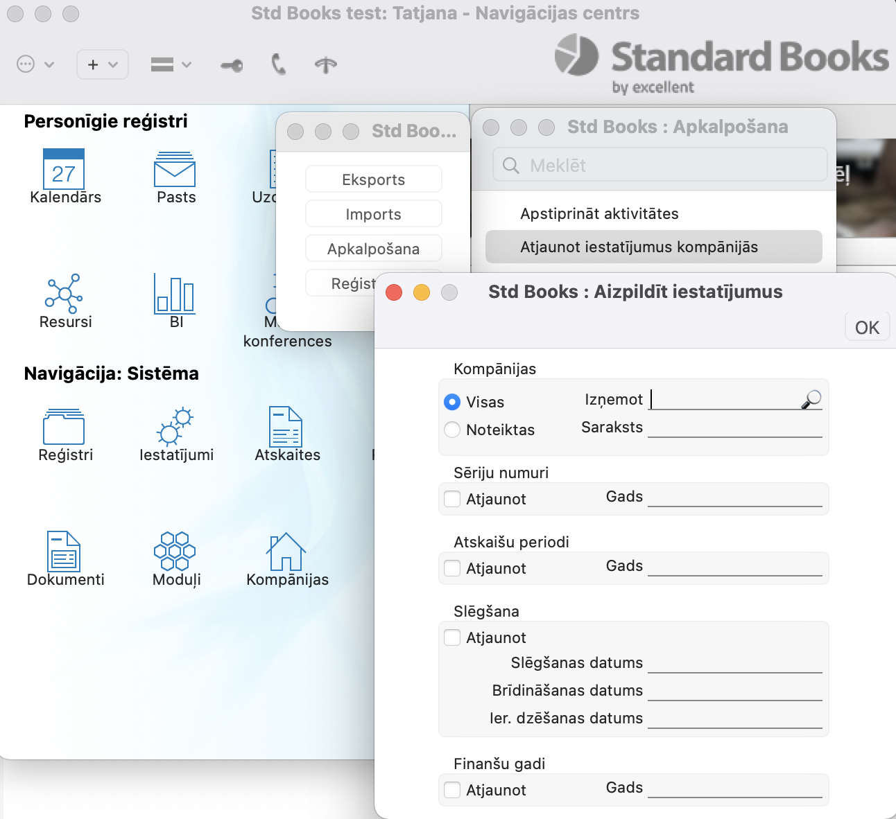NB! Apkalpošana uz pašlaik strādā moduļos Finanses, Sistēma, Realizācija, Piegādātāji, Pamatlīdzekļi, Algas, Personāls, Avansa norēķini