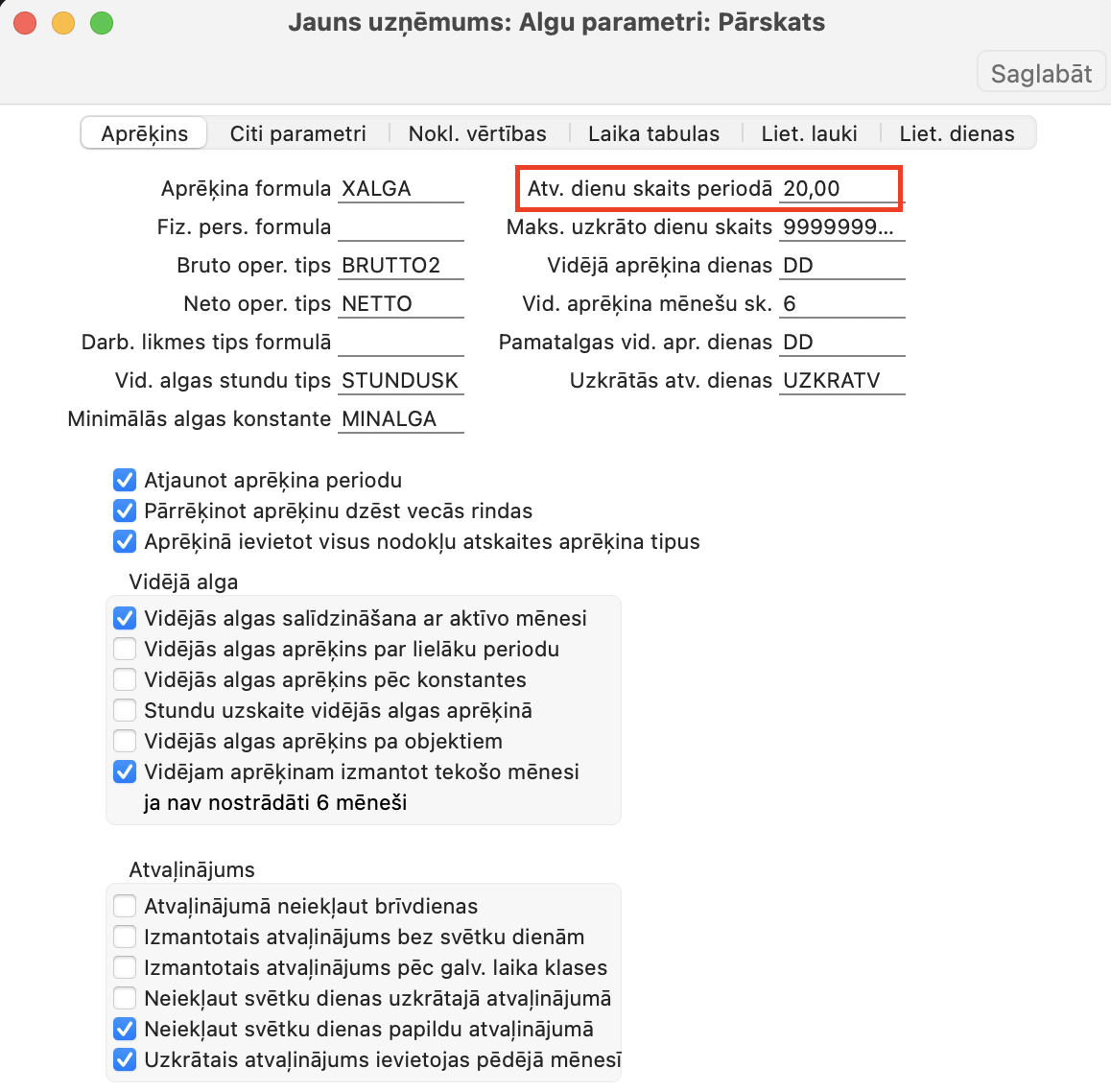 Algas > Iestatījumi > Algu parametri > Atv.dienu skaits periodā > 20 darba dienas ir pēc noklusējuma. Šis iestatījums atteicas uz visiem darbiniekiem.