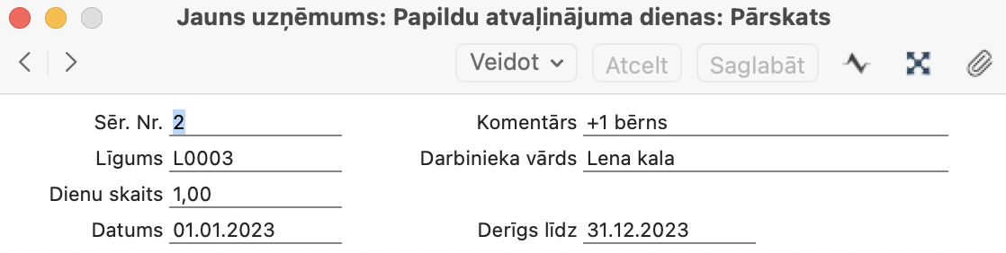 Ja kādam darbiniekam kāda iemesla dēļ pienākas papildus atvaļinājuma diena (piemēram, par bērnu/iem, asins nodošanu utt.), tās jānorāda Algas > Iestatījumi > Papildu atvaļinājuma dienas.