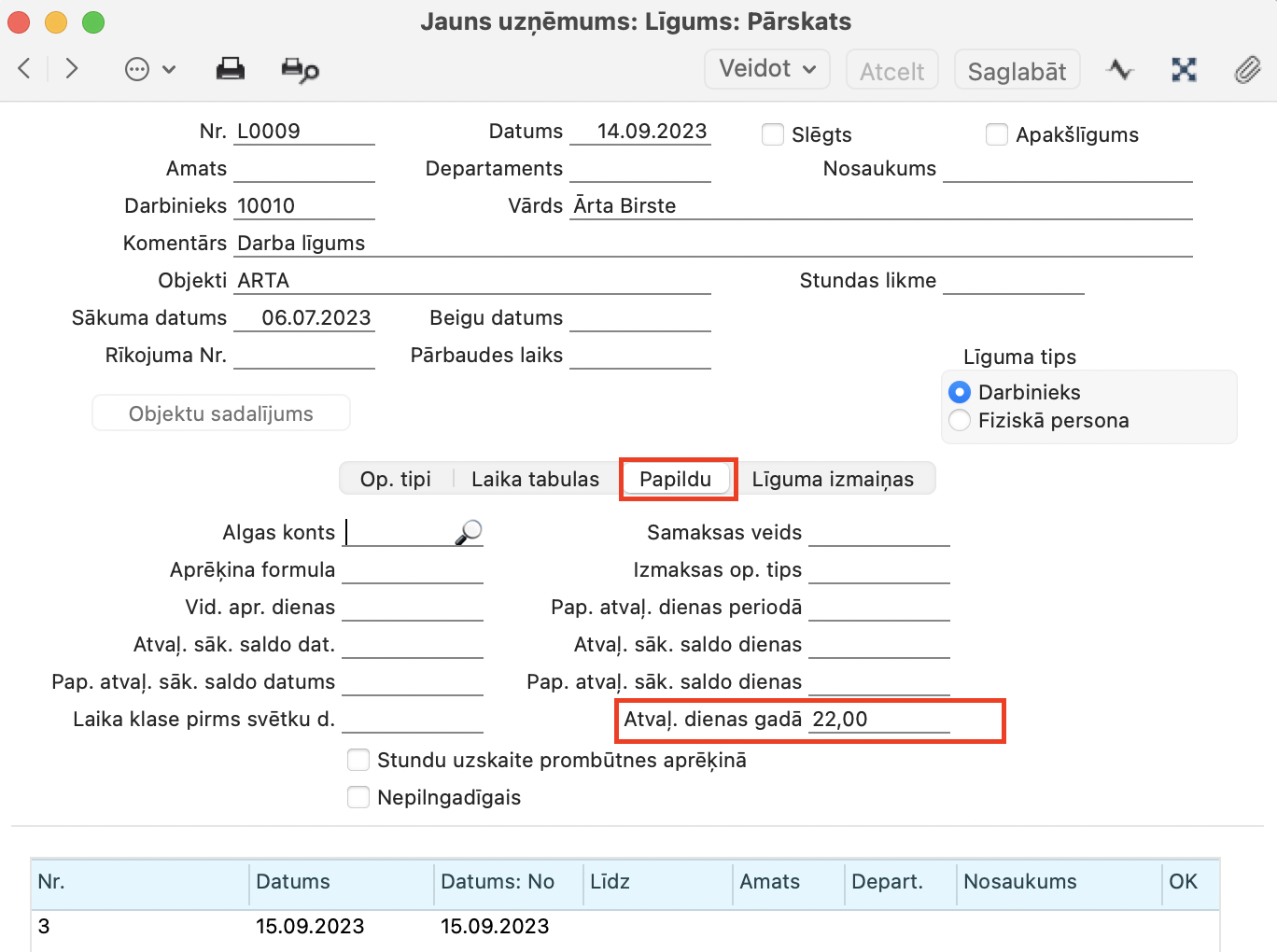 Ja darbiniekam atvaļinājuma dienu daudzums gadā mainās uz citu vērtību, (piemēram, no 20 darba dienām uz 23 darba dienām), tad izmaiņas jānoformē Līguma izmaiņās (Algas > Reģistri > Līgumi > Veidot līguma izmaiņu ierakstu > Papildu > Atvaļinājuma dienas gadā)