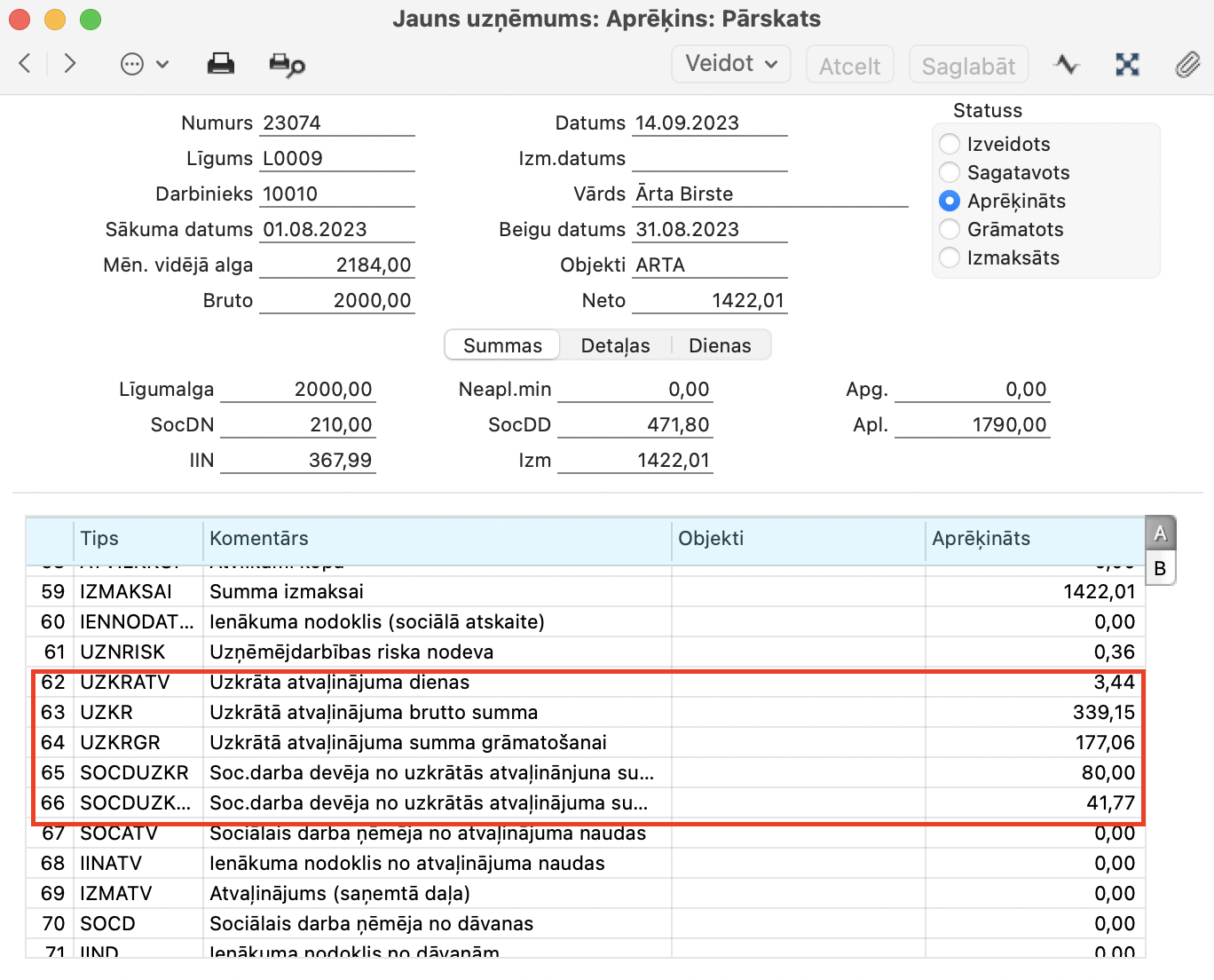 Tās pašas vērtībās atspoguļosies algu aprēķinā par 08.2023 periodu (Algas > Reģistri > Aprēķini)