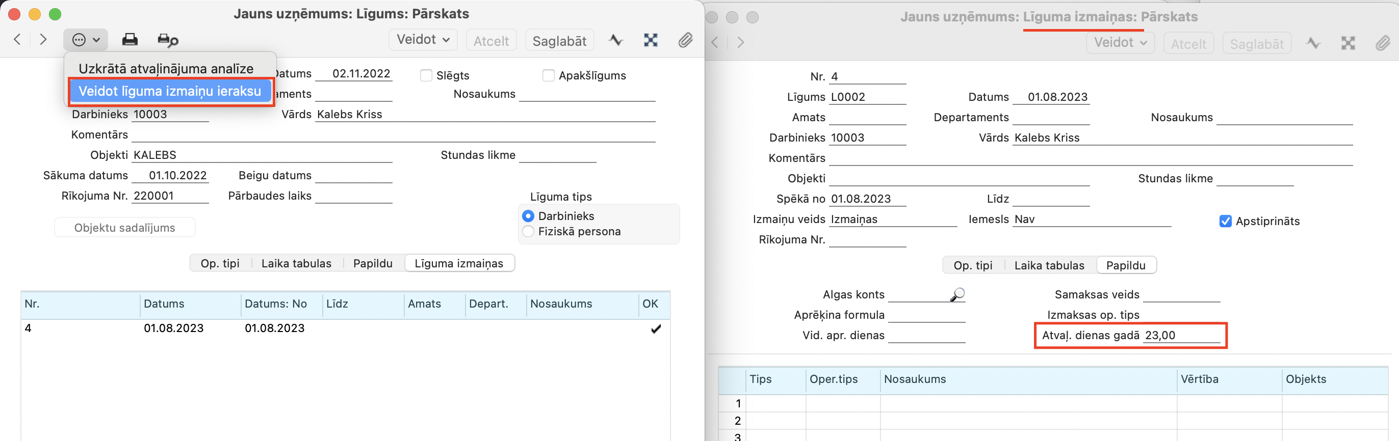 Ja darbiniekam atvaļinājuma dienu daudzums gadā mainās uz citu vērtību, (piemēram, no 20 darba dienām uz 23 darba dienām), tad izmaiņas jānoformē Līguma izmaiņās (Algas > Reģistri > Līgumi > Veidot līguma izmaiņu ierakstu > Papildu > Atvaļinājuma dienas gadā)