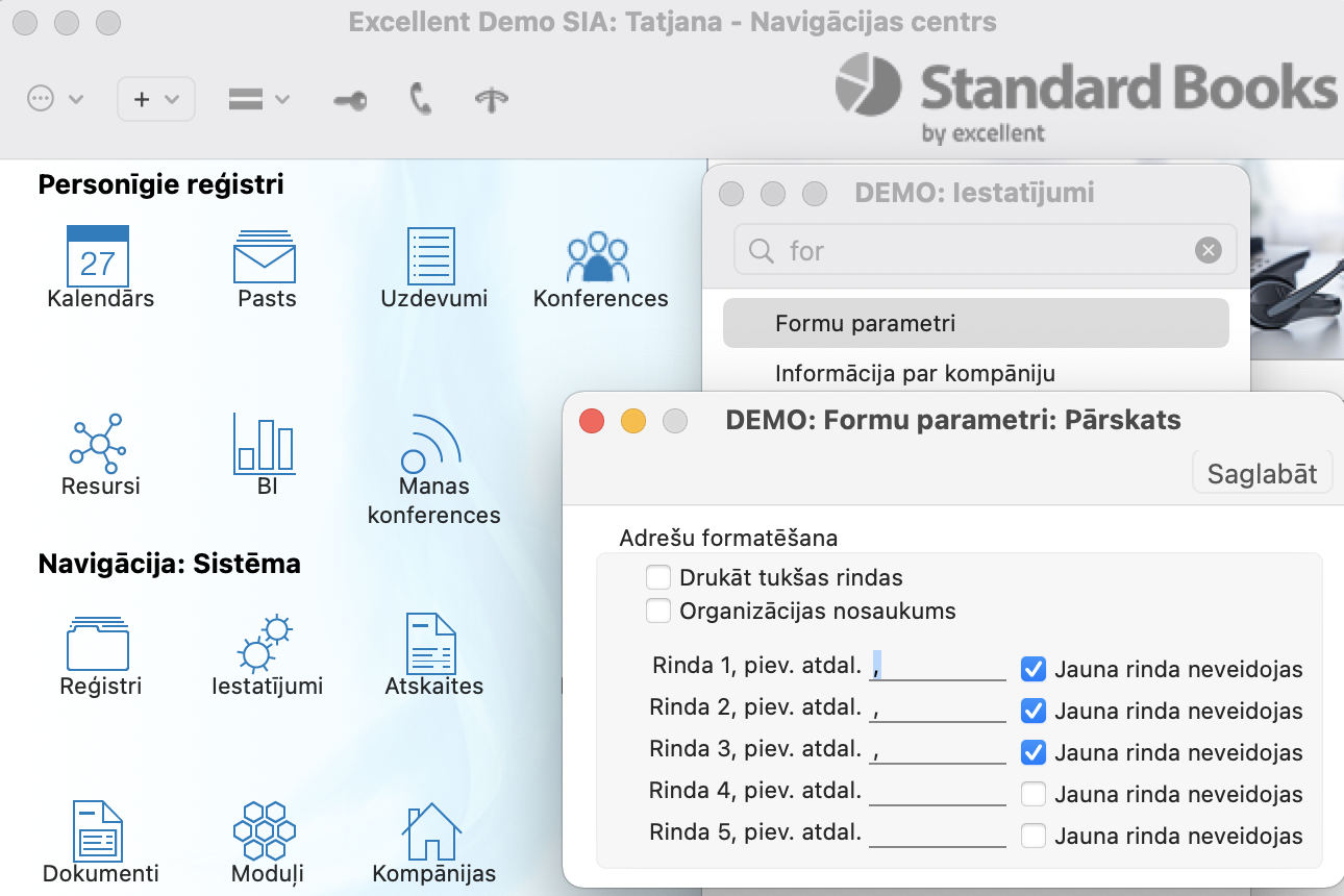 Standard Books sistēmā ir iespēja iestatīt tā, lai dokumentu formās adresi izvietotu vienā rindā, nevis divās, trīs vai četrās.