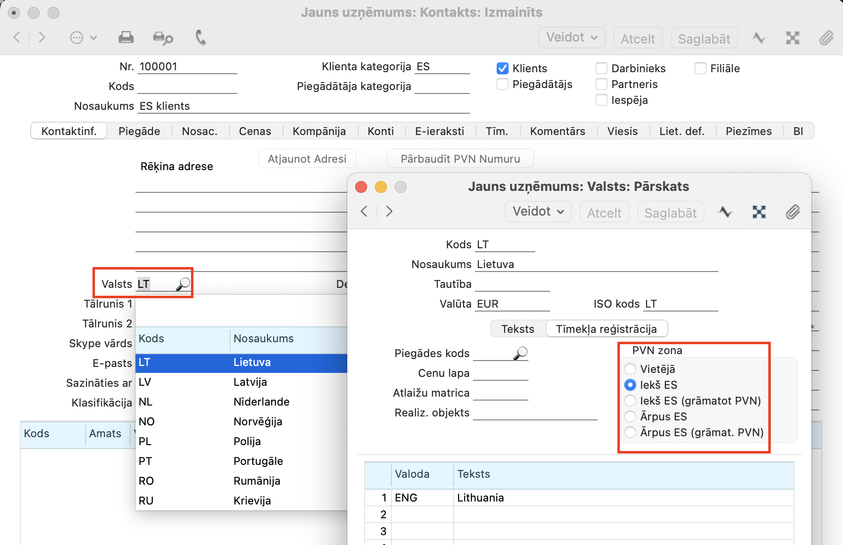1. Veidojot kontakta kartīti ES klientam (Realizācija > Reģistri > Kontakti), mēs vienmēr sadaļā Kontaktinformācija aizpildām lauku “Valsts”, jo tā vērtība cieši saistīta ar PVN zonu, kuru programma izmantos PVN deklarācijas aizpildīšanai.