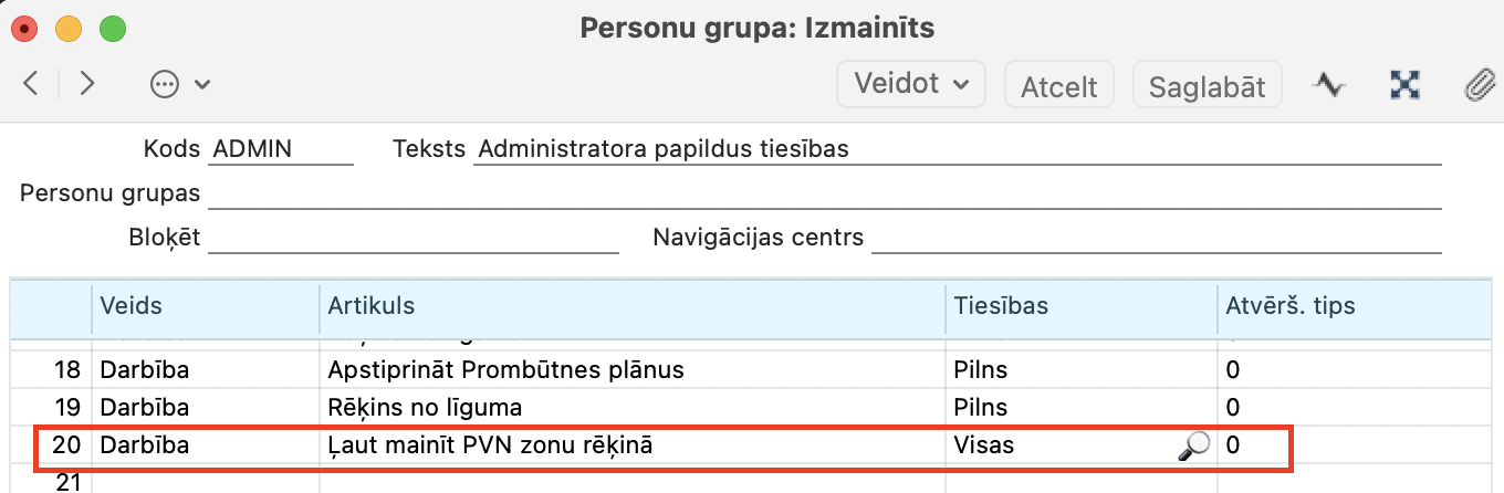 2. Sistēma > Iestatījumi > Personu grupa ir jāpievieno Darbību “Ļaut mainīt PVN zonu rēķinā” – konkrētai personai (darbiniekam) piešķir tiesības veikt izmaiņas PVN zonā, veidojot rēķinu.