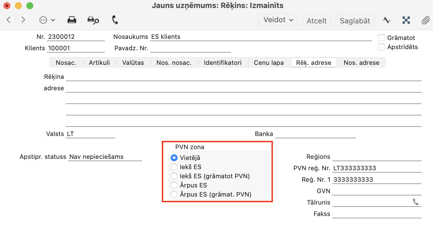 - sadaļā Rēķ. adrese, jānomaina PVN zonu uz vietējo (piemērā lejā, PVN zona “iekš ES” tiek nomainīta uz “Vietējā”)