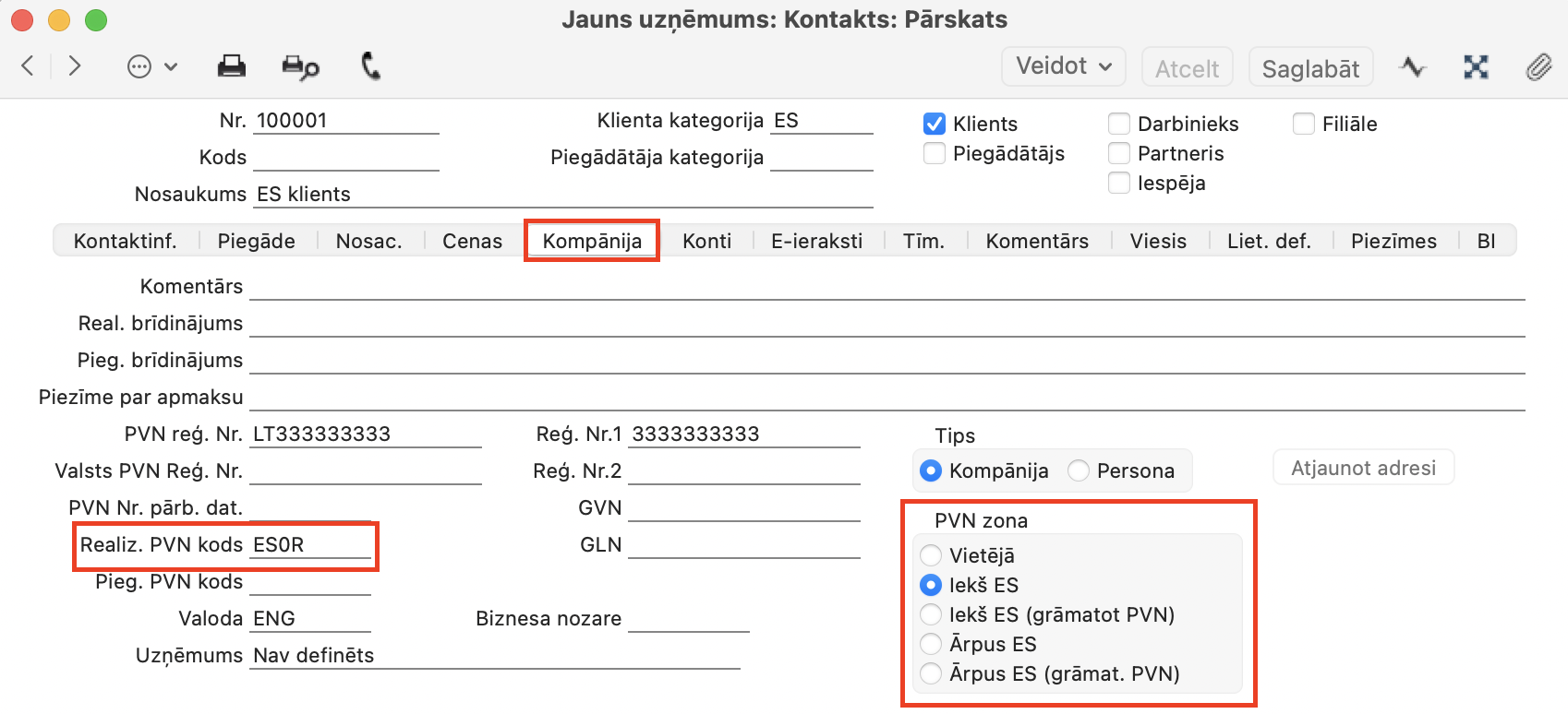 Kontakta kartītes sadaļā Kompānija uzreiz būs redzama PVN zona un laukā “Realizācijas PVN kods” ir iespēja ievietot PVN likmi, ar kuru tiek veidoti visi rēķini pēc noklusējuma (piemērā lejā, PVN kods ir “ES0R”).