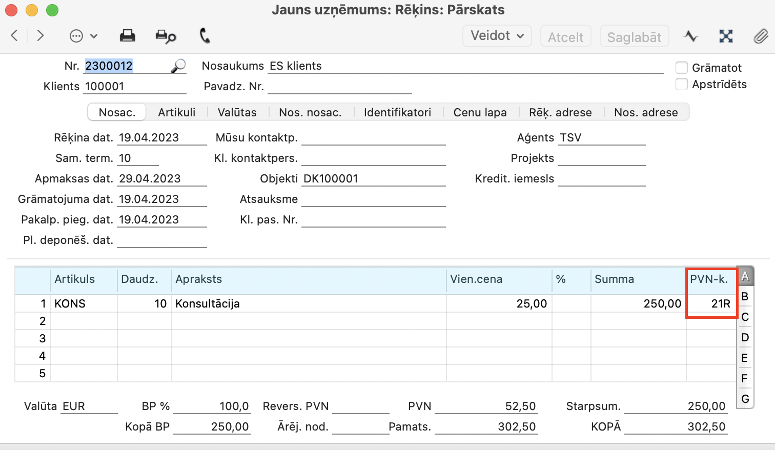 - jānomaina PVN kodu uz vietējo sadaļā Nosac. (piemērā, lejā ES zonas PVN kods “ES0R” tiek nomainīts uz vietējo “21R”).