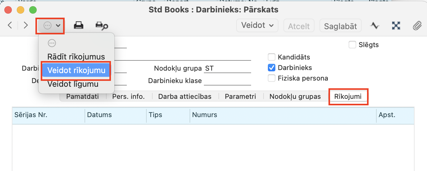 Darbinieku kartītē, sadaļā Rīkojumi, izspiežot Operācijas izvēlni > Veidot rīkojumu