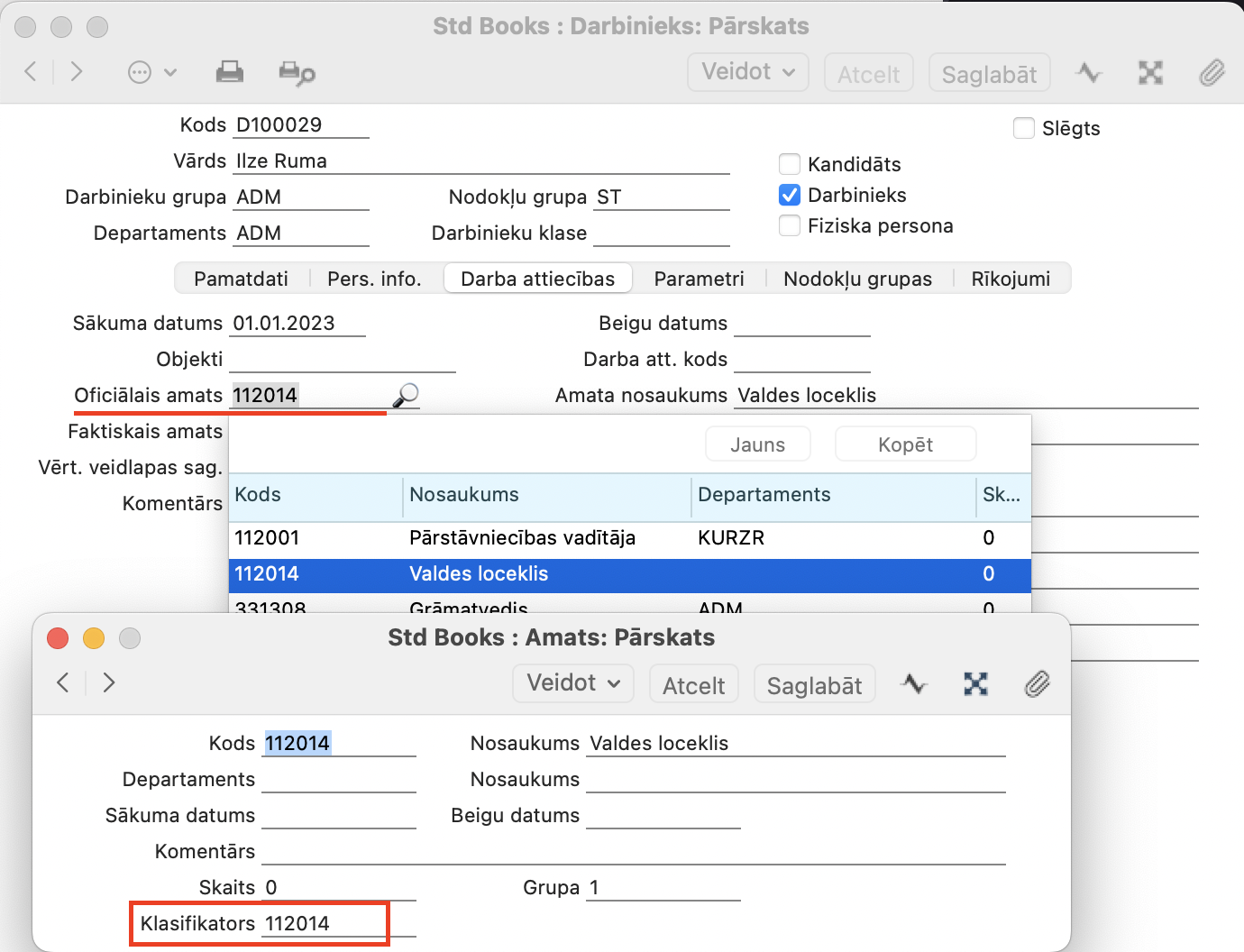 Darbinieku kartītē, sadaļā Darba attiecības, tiek aizpildīti lauki Oficiālais amats vai Faktiskais amats (vai abi kopā, ja tie atšķiras). Svarīgi, lai Amata ierakstā, kuru atsevišķi var iestatīt Personāls > Reģistri > Amati, laukā Klasifikators tika norādīts Profesiju kods, kas ir nepieciešams iesniegšanai uz EDS.