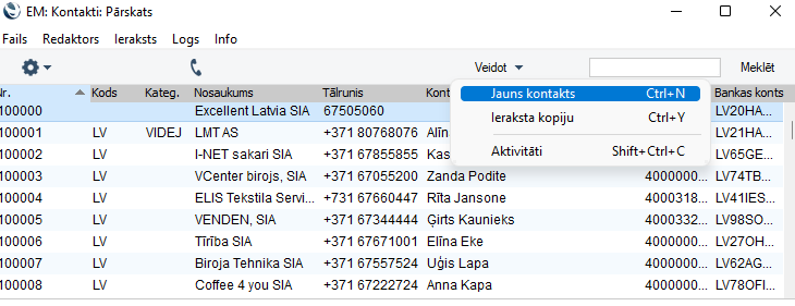 Jaunus kontaktus var ievadīt vairākos moduļos, kuriem ir kontaktu katalogs (piemēram, Realizācija, Pārdošanas vadība, Loģistika, Piegādātāji, CRM). Kontaktu reģistrs ir koplietošanā, tāpēc vienā modulī ievadītā informācija būs redzama visos pārējos moduļos. Lai izveidotu jaunu kontaktu, atveriet Kontaktu reģistra pārskata logu un izvēlnē “Veidot” izvēlieties “Jauns kontakts”.