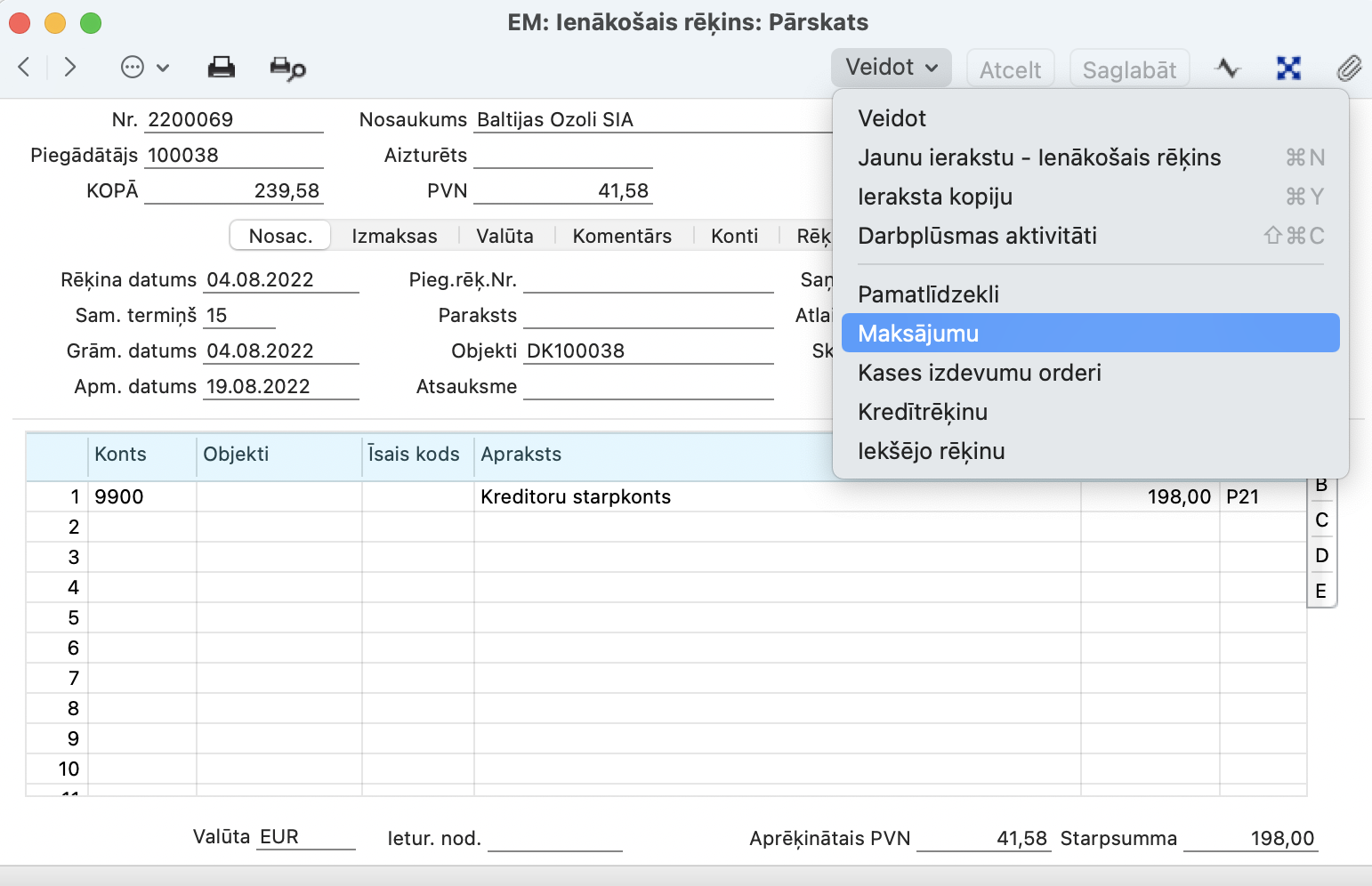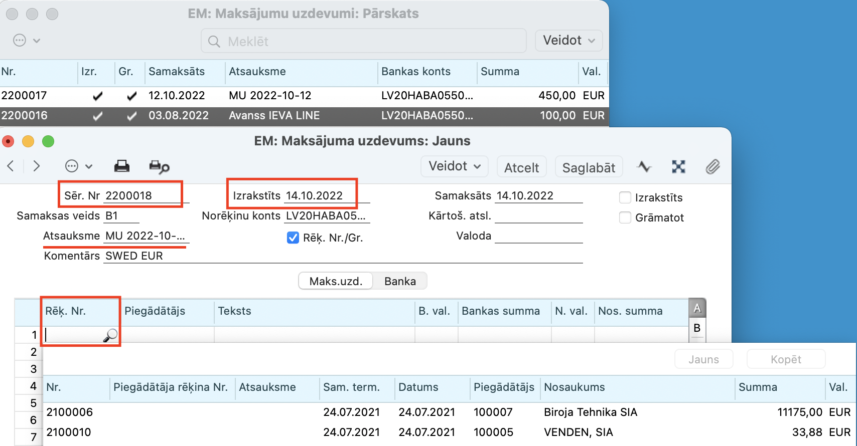 NB! Rēķinam jābūt iegrāmatotam, lai maksājuma uzdevuma ieraksts aizpildītos.