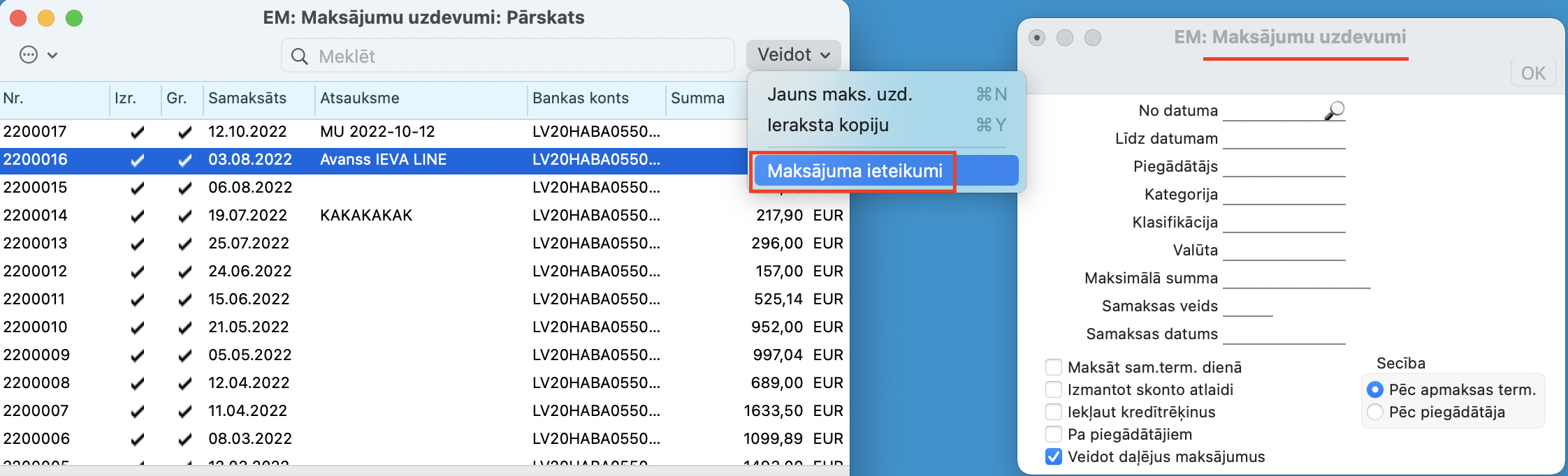 2.1. Atveriet maksājumu uzdevumu sarakstu (pārskata logu) un izvēlieties “Veidot – Maksājuma ieteikumi”.