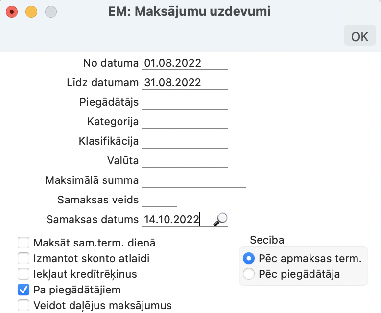 - Ievietojot periodu no …. līdz …, norādot Samaksas datumu un atķeksējot “Pa piegādātājiem”, sistēma automātiski katram piegādātājam izveidos maksājuma uzdevumu par neapmaksātiem rēķiniem atsevišķā ierakstā