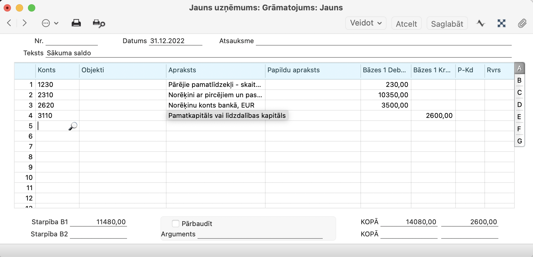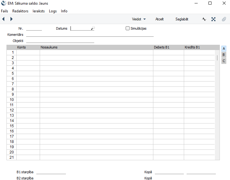 Laukos “Debets B1” un “Kredīts B1” ievadiet vērtības vietējā valūtā. Citās valūtās ievadiet Sākuma atlikuma summu ieraksta C daļā.