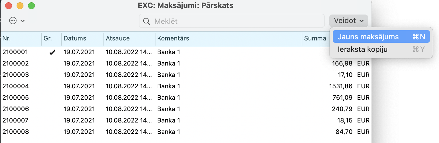 1.1. Atveriet maksājumu sarakstu (pārskata logu) un izvēlnē Veidot izvēlieties Jauns maksājums.