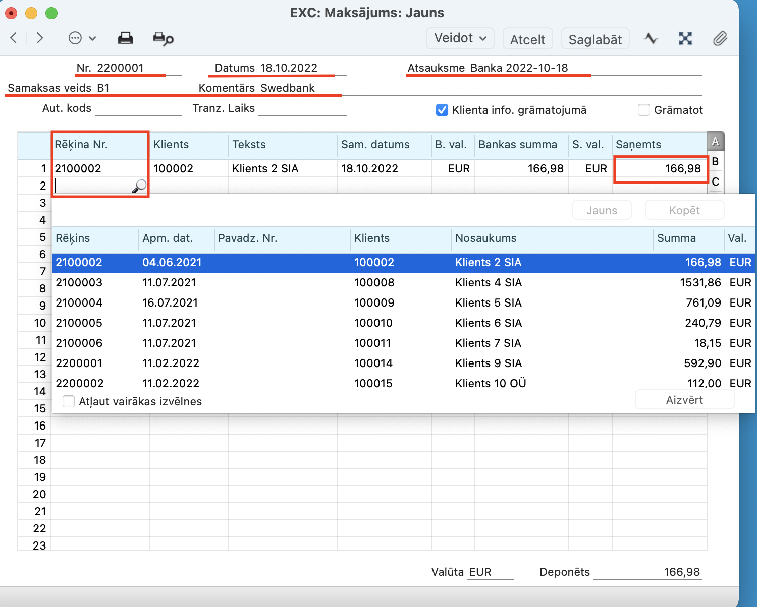Vienā maksājumu ierakstā var ievadīt vairākus Klientu maksājumus par vairākiem Rēķiniem. Ir iespējams izmantot arī dažādus Samaksas veidus: katrai rindai ir iespējams norādīt savu Samaksas veidu, ja tas atšķiras no galvenē norādītā.