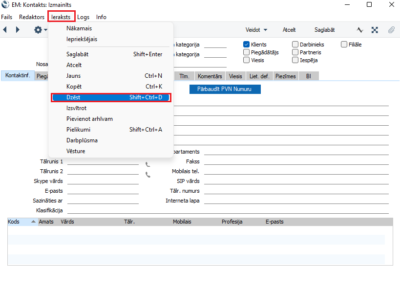 Ja kontakta ieraksts vēl nav izmantots, tad to var vienkārši izdzēst: atveriet ierakstu un “Ieraksta” izvēlnē izvēlieties “Dzēst”.