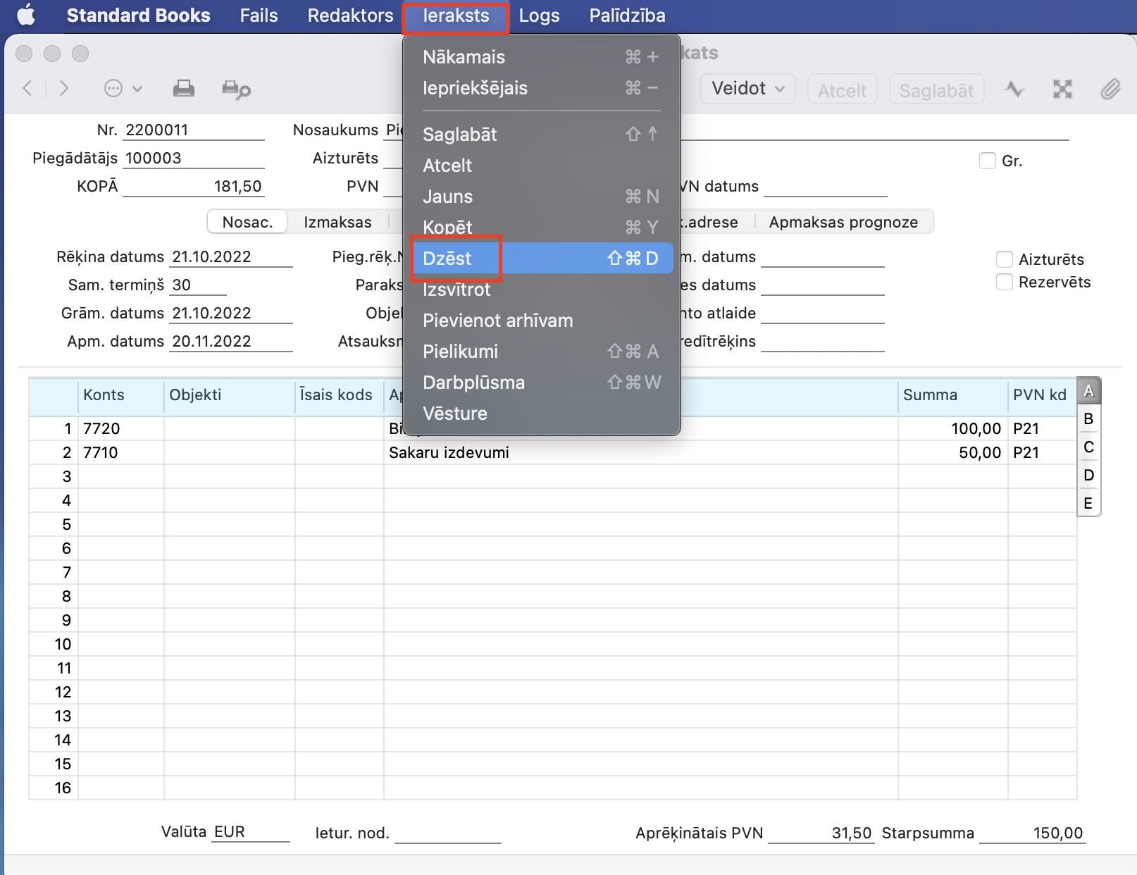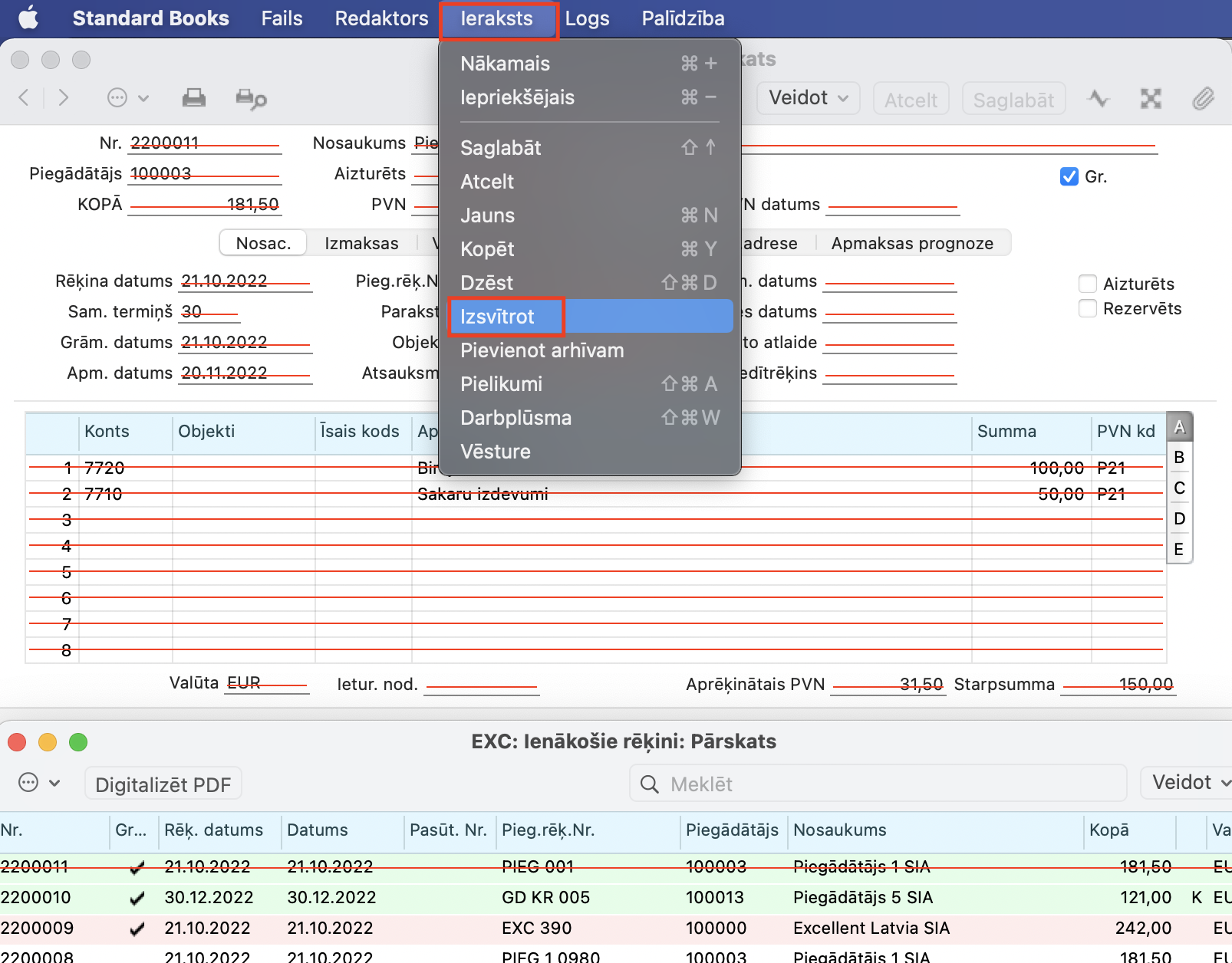 Ja tomēr rēķins tika apstiprināts (iegrāmatots), tad to ir iespējams izņemt no kopējā aktīvo rēķinu saraksta izmantojot izvēlnē “Ieraksts” funkciju “Izsvītrot”. Uz rēķina parādīsies sarkanas līnijas, un to pašu rēķina numuru vairs izmantot nevarēs (rēķins būs atcelts un nekur neparādīsies).