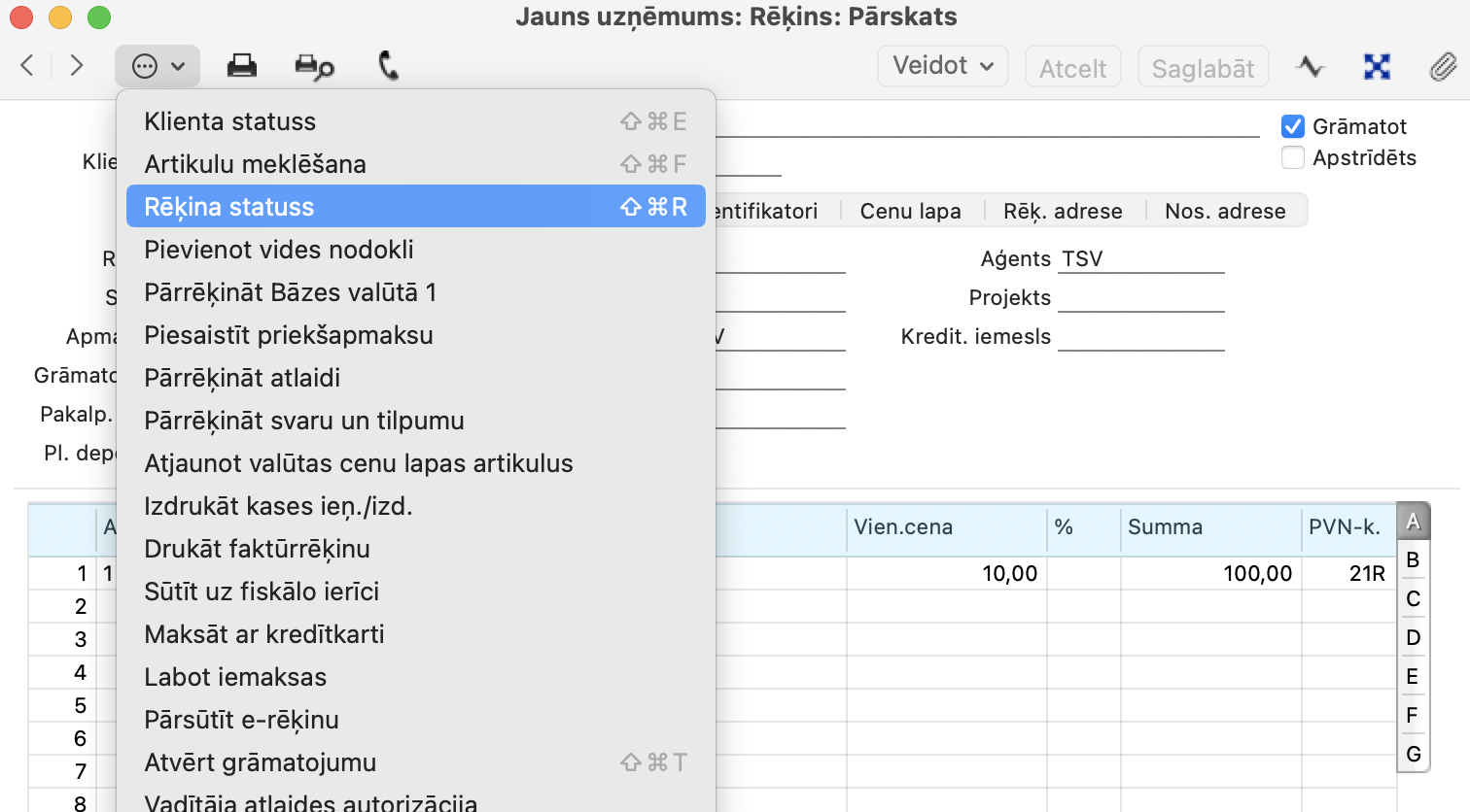 a) Rēķina statusa atskaiti, kuru ir iespējams atvērt tieši no paša rēķina ieraksta. Rēķins > “Zobrata” Operāciju izvēlne > Rēķina statuss